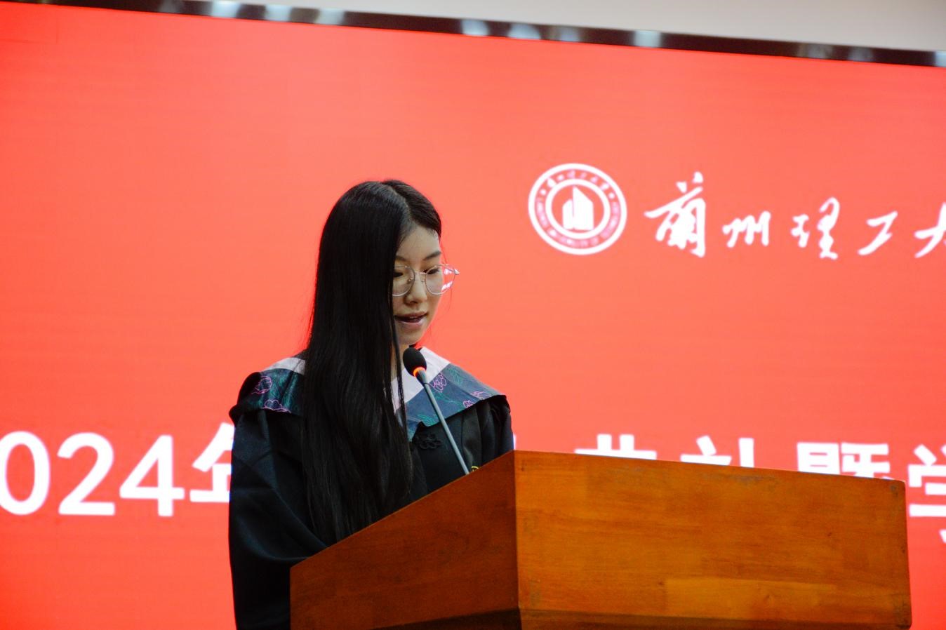 在庄严的国歌声中典礼隆重开始。卢少卿及学院班子成员分别宣读学校相关文件,表彰了优秀毕业生和先进集体,并为2024届员工班级联络员颁发聘书。毕业生代表于雨萌发言中,表达了对母校和老师、同学们的感激不舍,表示全体毕业生将在母校的注视下,在红柳精神的推动下,以饱满的战斗激情,以工大人特有的姿态,去投身社会,服务社会,奉献青春,实现自我。教师代表原新利教授祝愿2024届全体毕业生在未来的学习和工作中,保持学习,生活自律,乐观积极,在挑战中磨练自己,变得更加成熟和坚强。